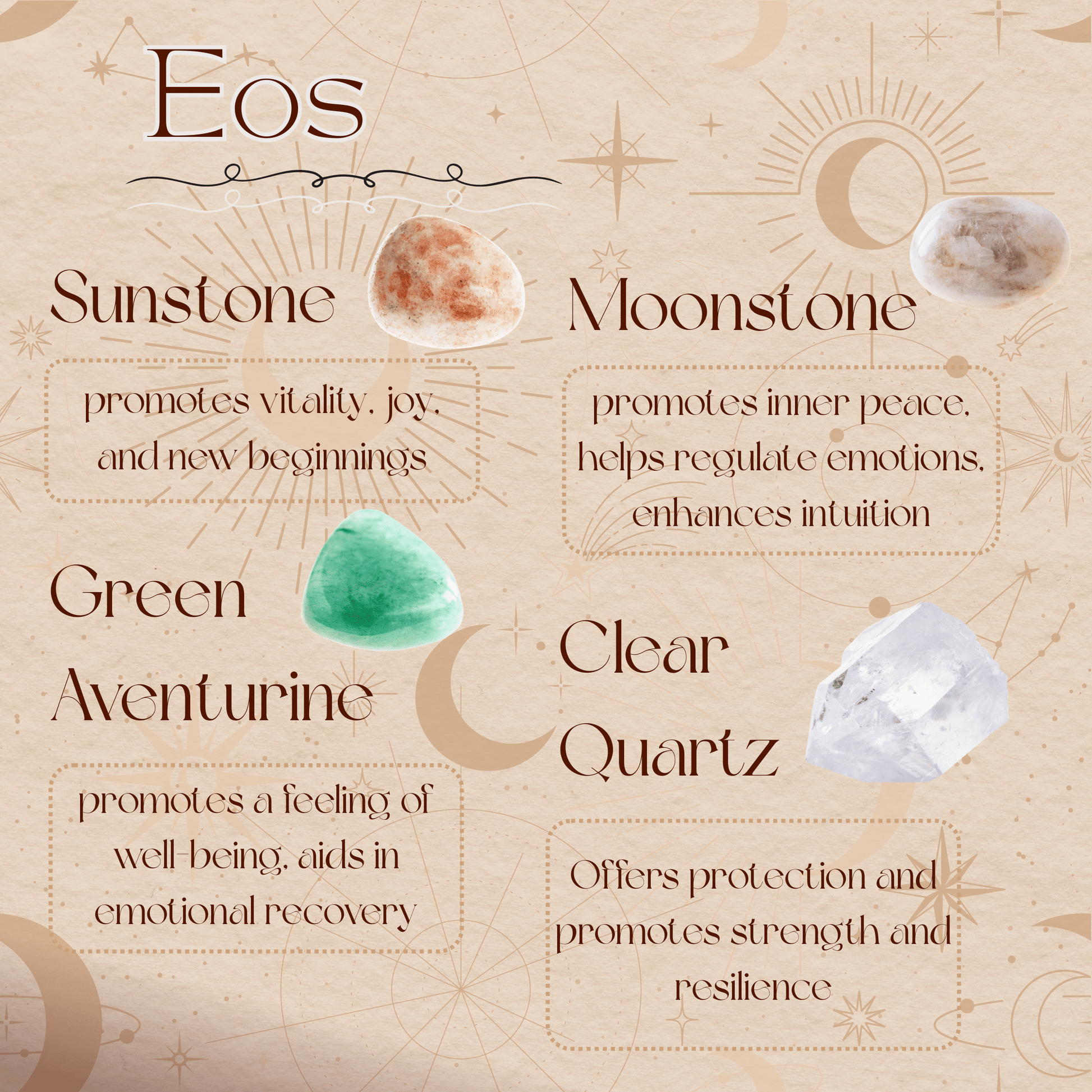 NOTE: Each bracelet features 3 to 4 of Eos’s chosen stones, intuitively arranged to mirror your own new beginning. Every piece is unique, made just for you. Crystal pieces may be raw, tumbled stones, towers, or elegant carvings. Each is selected with care to reflect what your spirit needs most.